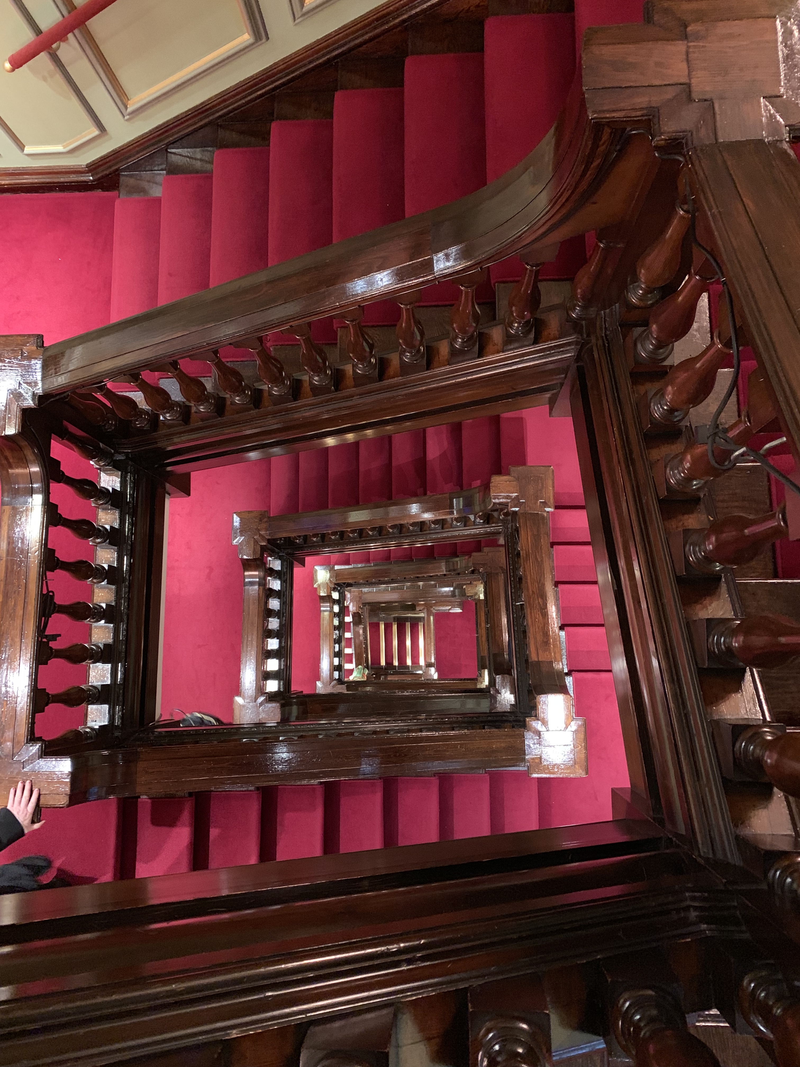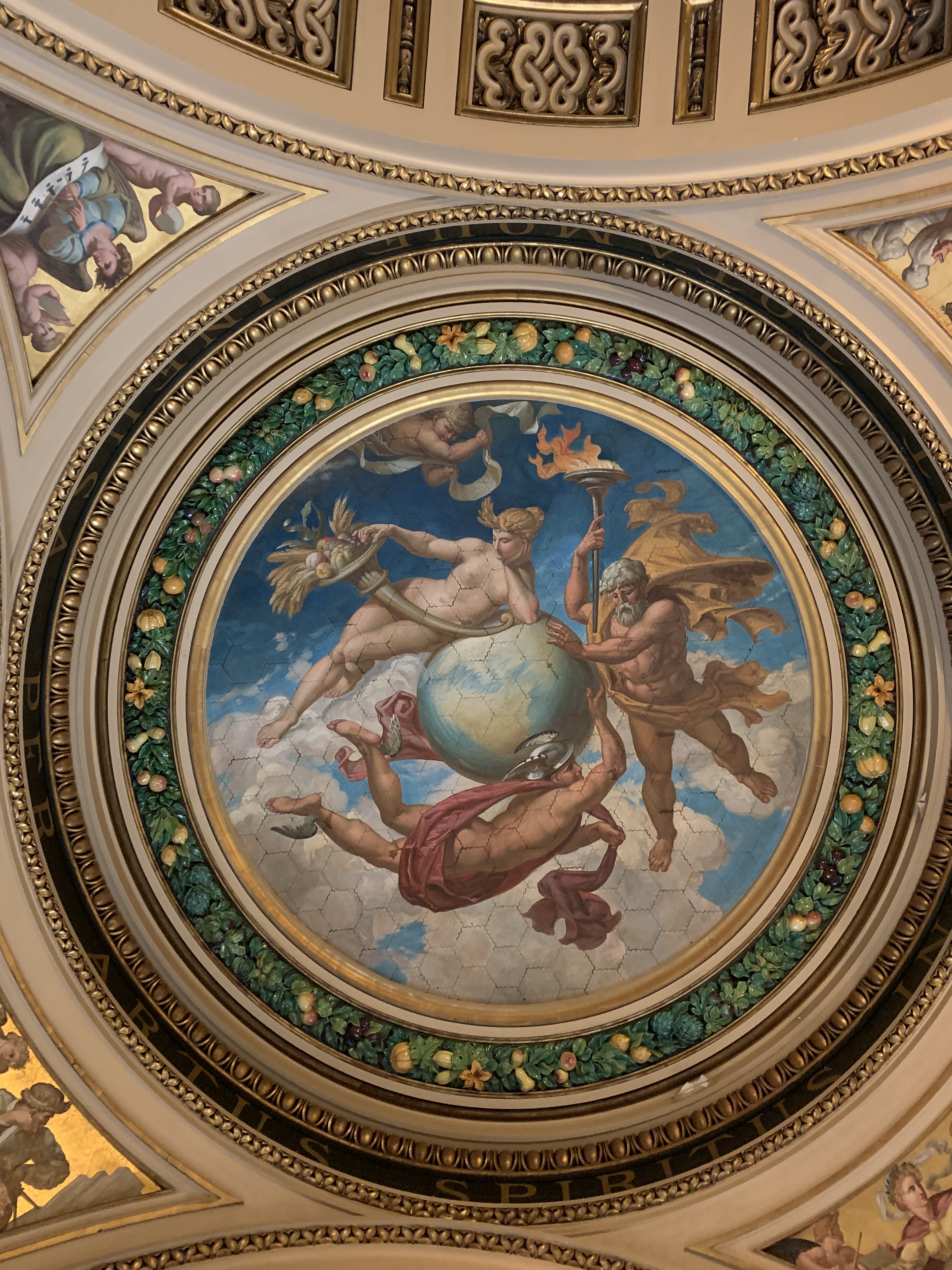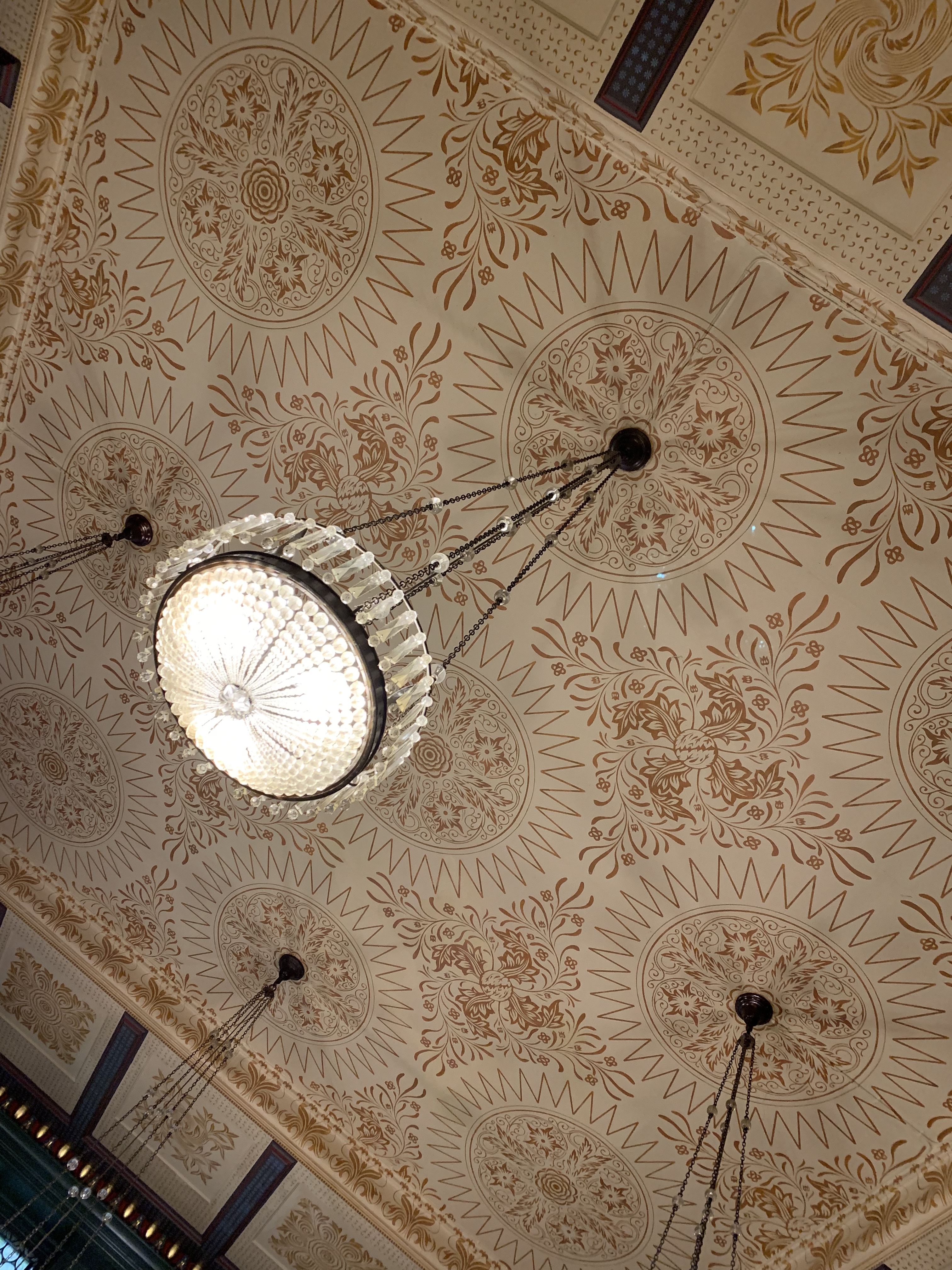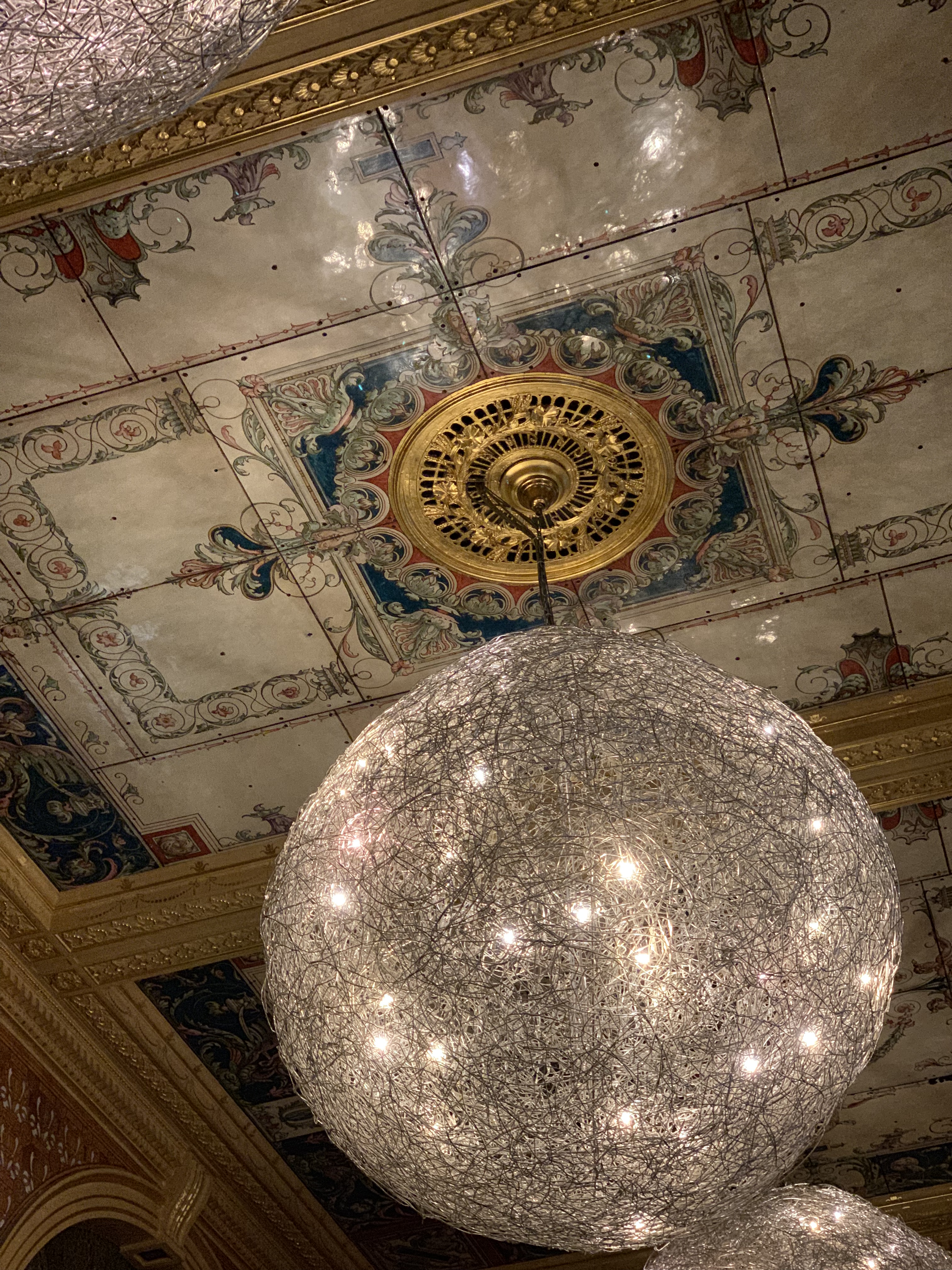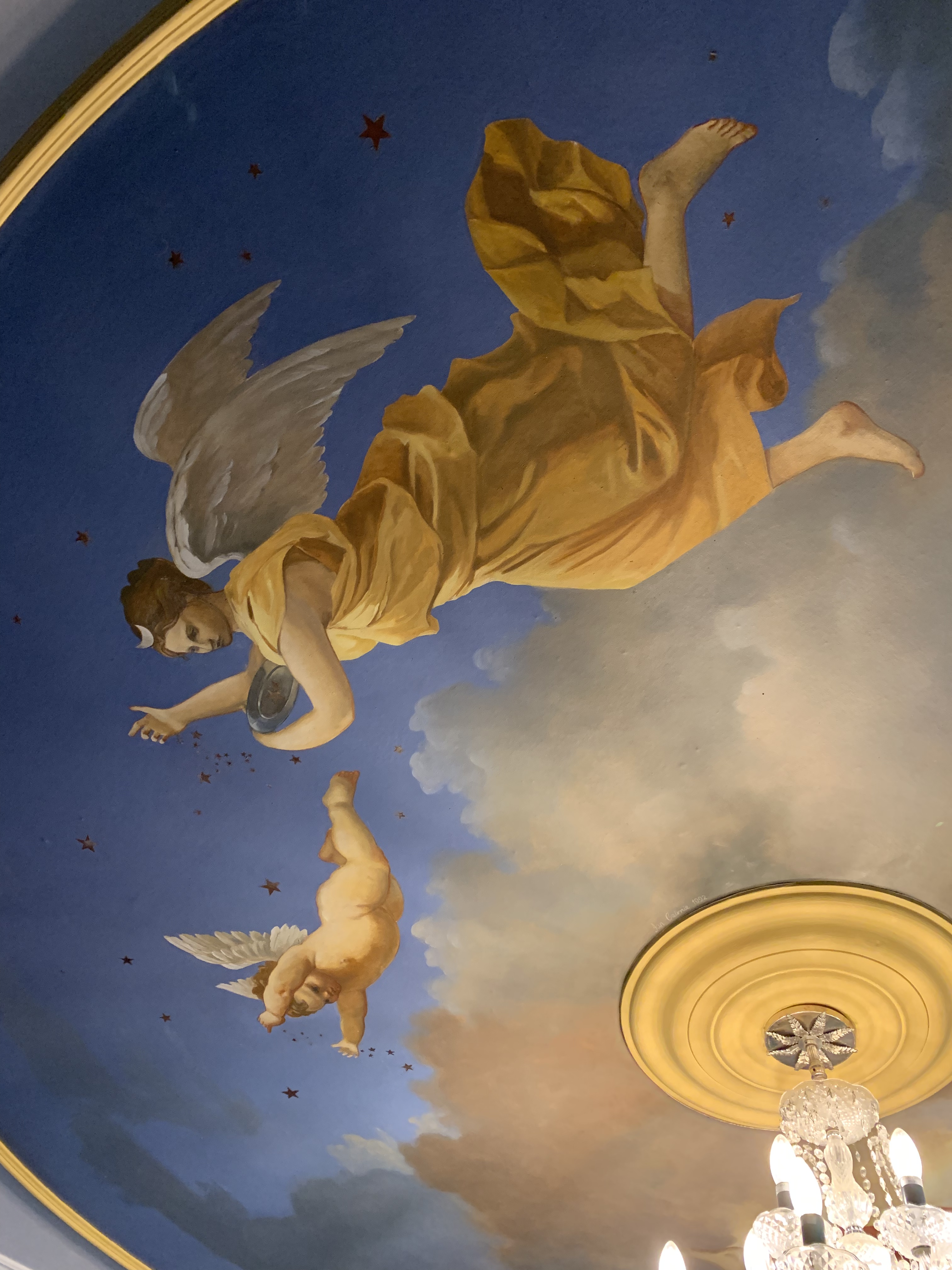 Downstairs I visited with a young electrician who was working on rewiring one of the chandeliers. Eventually they will all be dimmable and have the ability to change color. Cool, right?
