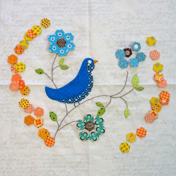 If you get my newsletter you will have seen the Hexy Bird block I’m working on now. I still have to add a pupil to the eye, stitch the blue hexies into flowers, and stitch the yellow and orange hexies together to make the larger hex that surrounds the bird—and then applique them to the block—but you can see where it’s going. I think this will be the center of a terrific baby quilt!
