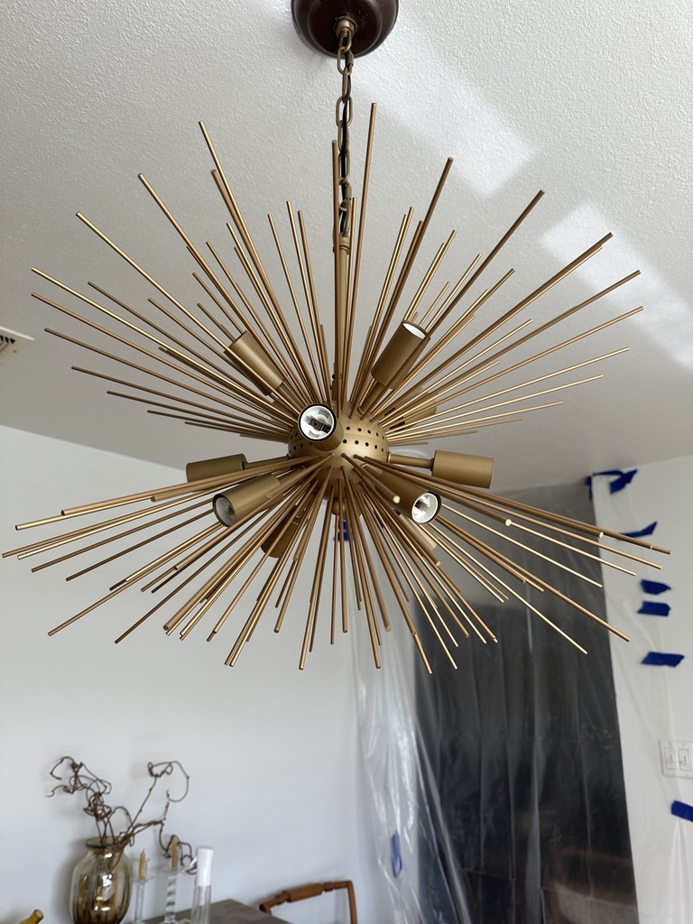 Side note: Belt sanders make a huge mess—I was happy that I had a mask on—but I should have covered the light fixture before sanding 🙄. Almost all of the rods in my Sputnik light fixture had to be unscrewed and everything thoroughly dusted. TIP: I put a tiny bit of Lolo Moisturizer on the threads before screwing them back in and that made the action smoother.