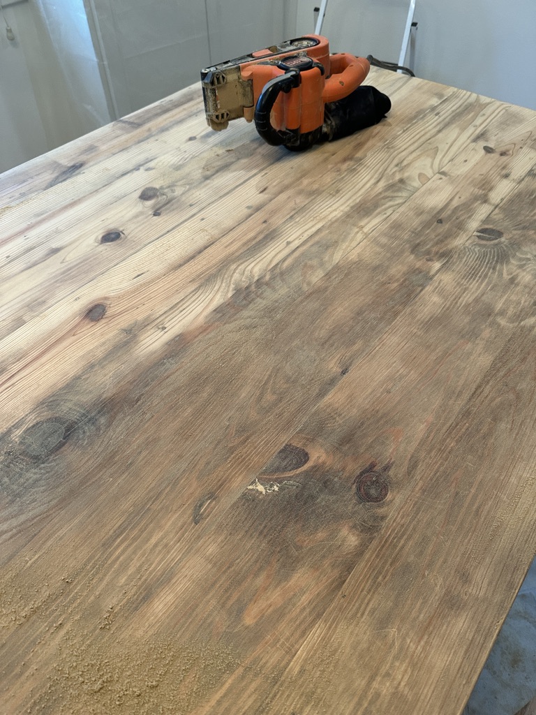 Then I sanded. So much sanding! 5 hours with the orbital sander and 50 grit sandpaper took off a lot of the finish, but not enough… I could still feel the gumminess in the wood.