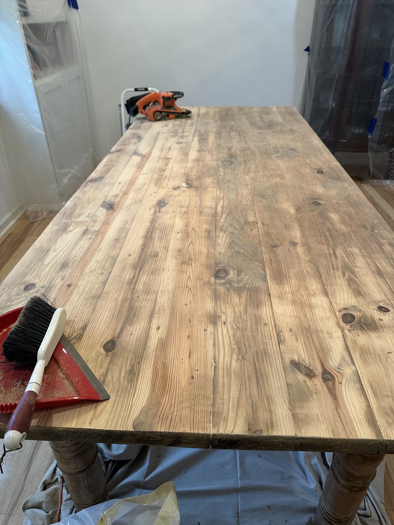 After a consult with Elizabeth (who makes our Mending Turnips) I pulled out the belt sander for 2 more hours of sanding with 80 grit sandpaper. I went through a lot of sandpaper because the finish was gummy and clogged the sandpaper but, as you can see below, I finally got down to clean wood.