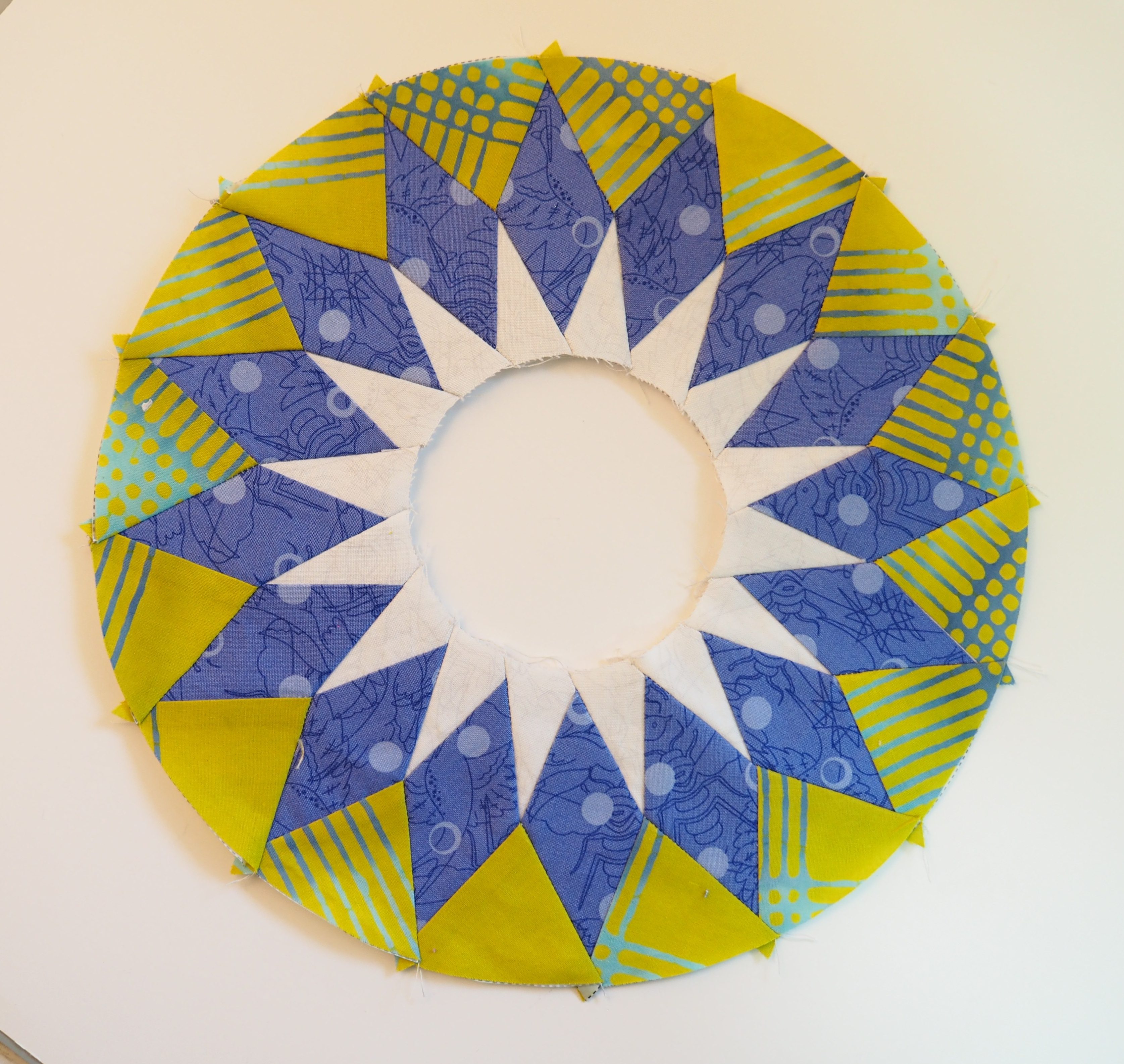 The quilt is constructed in rings. Each ring is made up of smaller segments that are sewn next to each other.