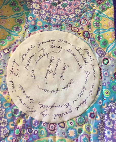 I especially love your documentation patch! I asked and Louann used a Pigma pen to hand write all the important information on it. In her own handwriting! It’s is nice touch to make it round to fit it into the print on the back of the quilt!