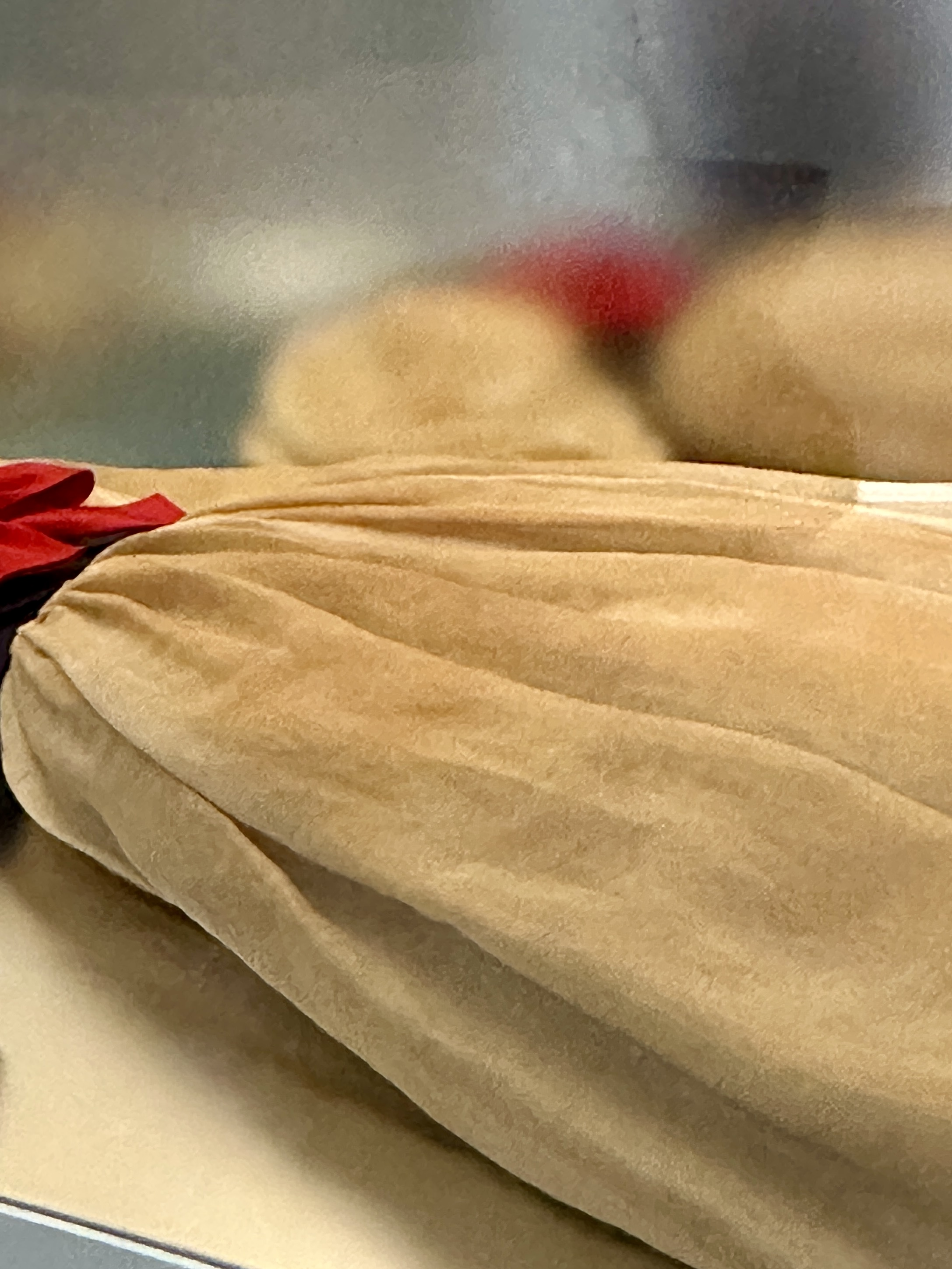 While this nautical-inspired ensemble remains in good structural condition, its visual appearance no longer represents the clean aesthetic of Norman Norell’s original design. Scientific analysis of the organdy has revealed that the discoloration is occurring not in the cotton fibers themselves but in a starching agent (polysaccharide gum) added to the cotton to provide sheen and stiffness. Although it is not unusual for starched cotton to yellow over time, the severity and the unevenness of the discoloration has made this dress unsuitable for display, as it distracts too much from the designer’s intention.