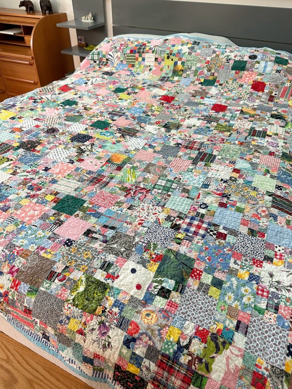 The quilt top I put on the back has alternating 3″ squares and 9-patches made from 1″ squares. There isn’t an underlying theme or color palette on this side. It is mostly prints, plaids, and stripes that are individually wonderful, but together are a hot mess. Your eyes have nothing to focus on.