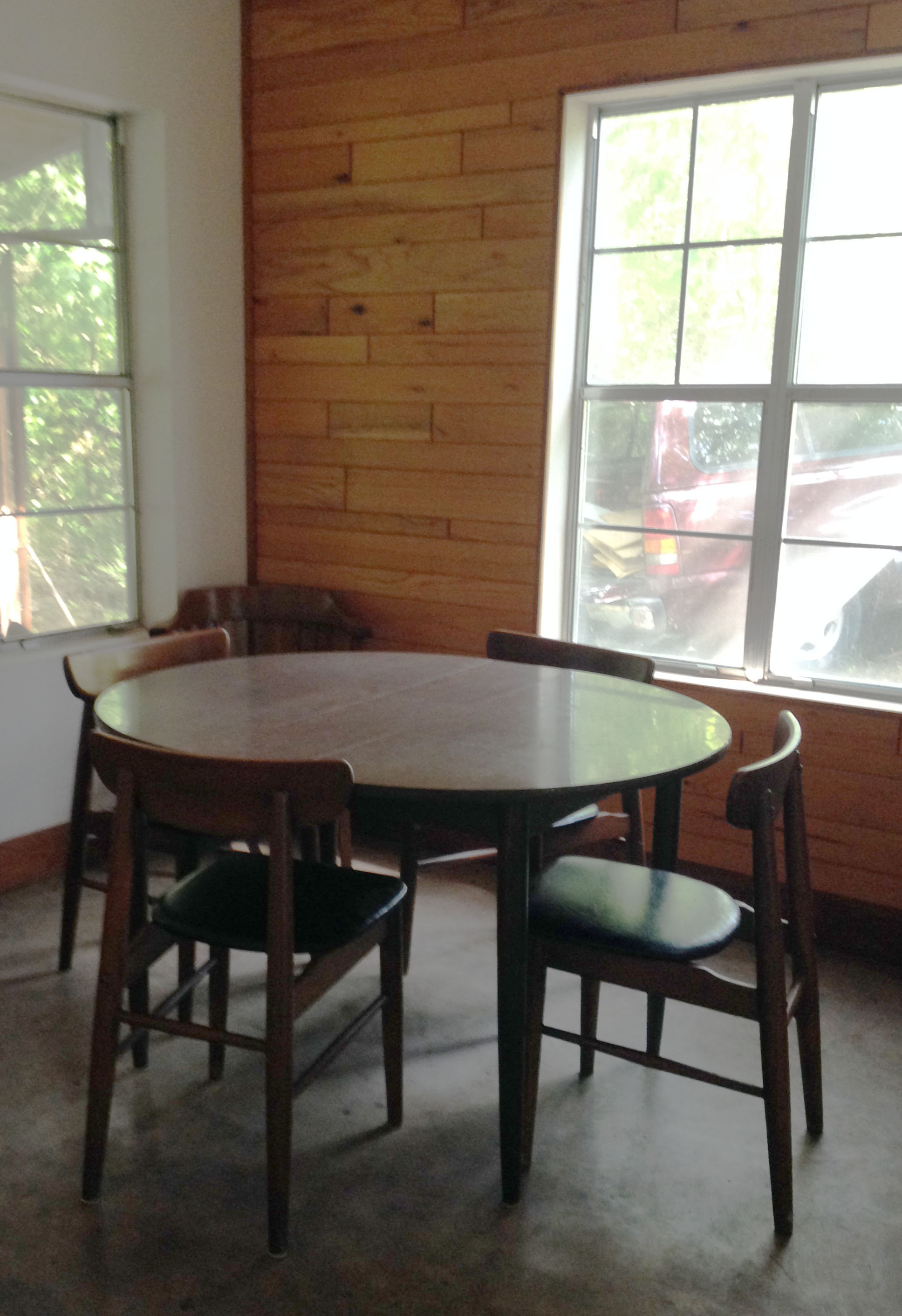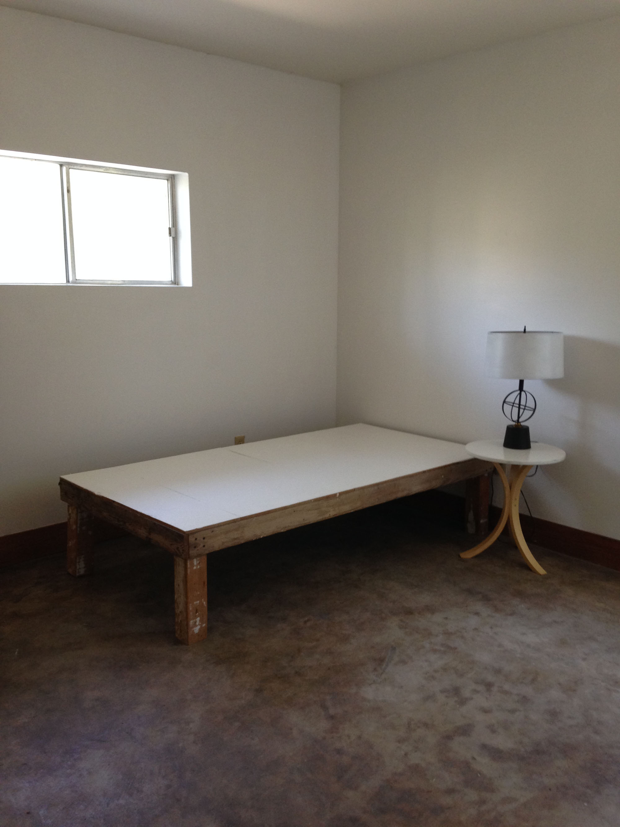 And, lastly, here’s one of the downstairs bedrooms, with one bed platform, a table, and reclaimed lamp… All we need are some more bed platforms and the Woods will be good to go!