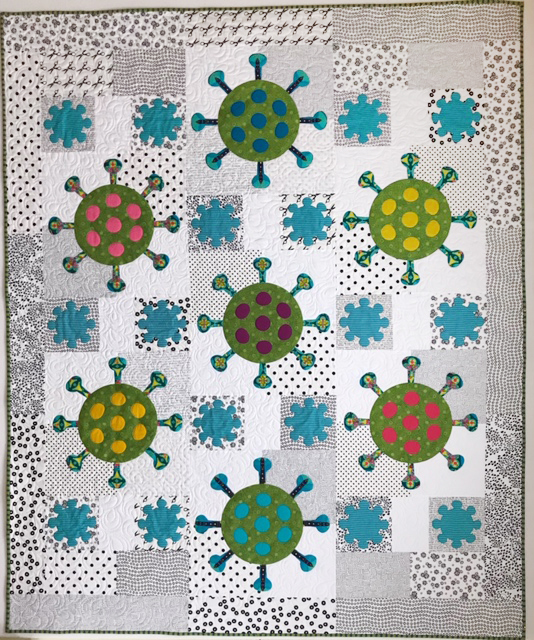 Lynn Savage has finished her COVID-19 themed quilt that features Block 1 from Searching for Beauty. I love it!!!! The little versions of the virus and the mix of bigger and smaller black and white prints make the bigger blocks stand out.